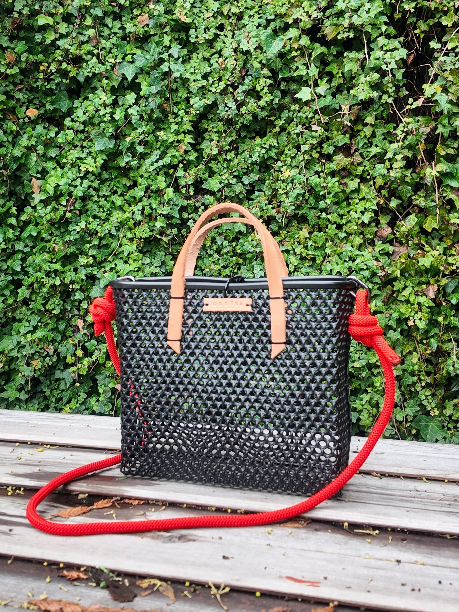 Materials: reclaimed oyster nets, local leather handles, retired climbing rope, rubber liner and zip ties.