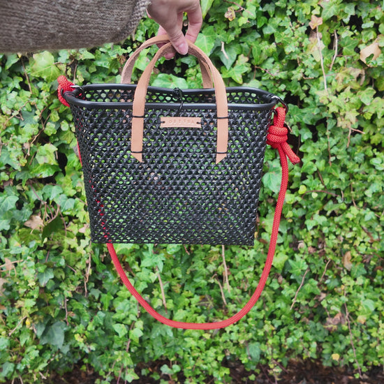 Materials: reclaimed oyster nets, local leather handles, retired climbing rope, rubber liner and zip ties.