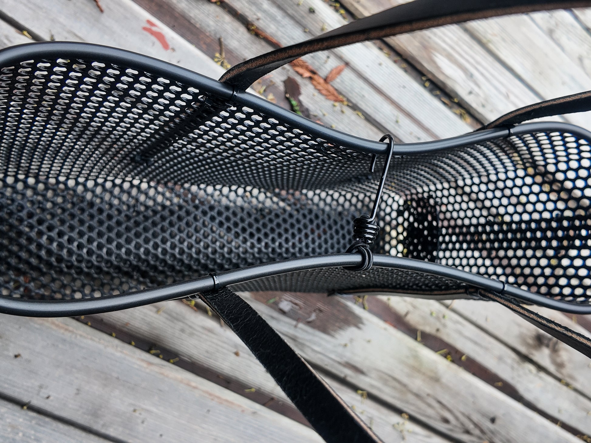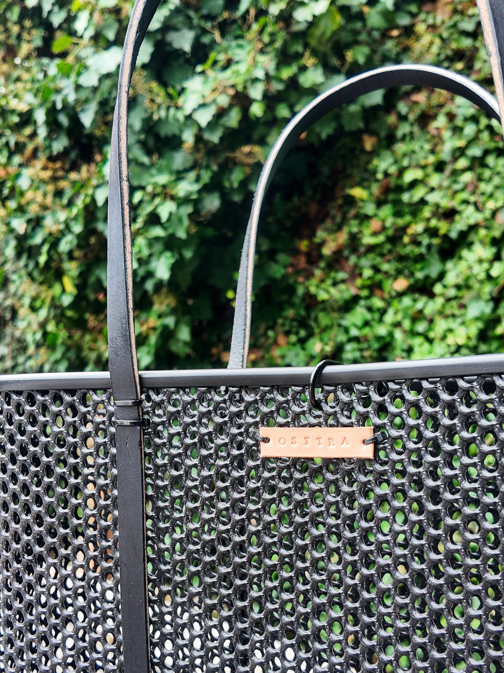 Materials: reclaimed oyster nets, leather handles, rubber liner and zip ties.
