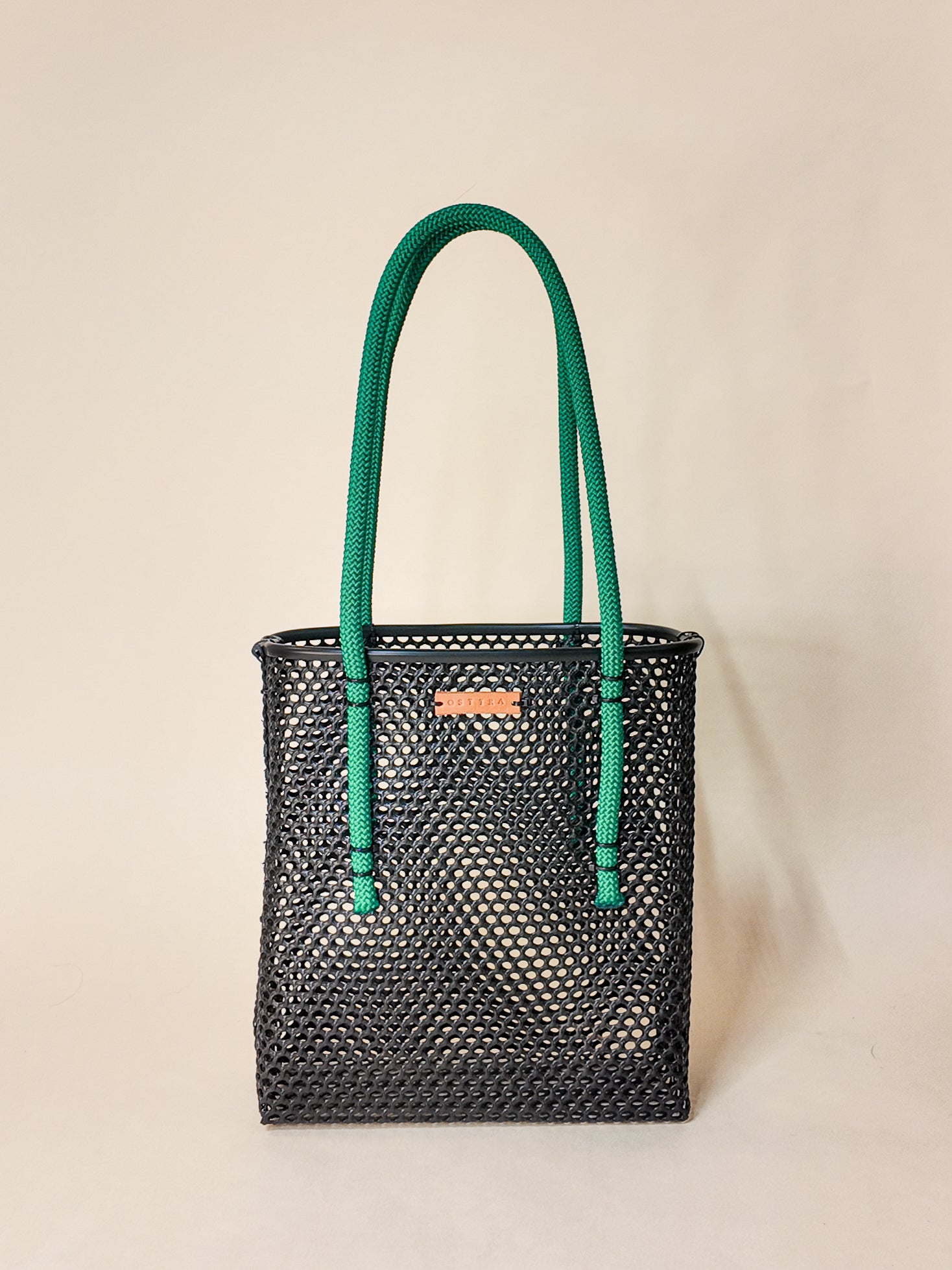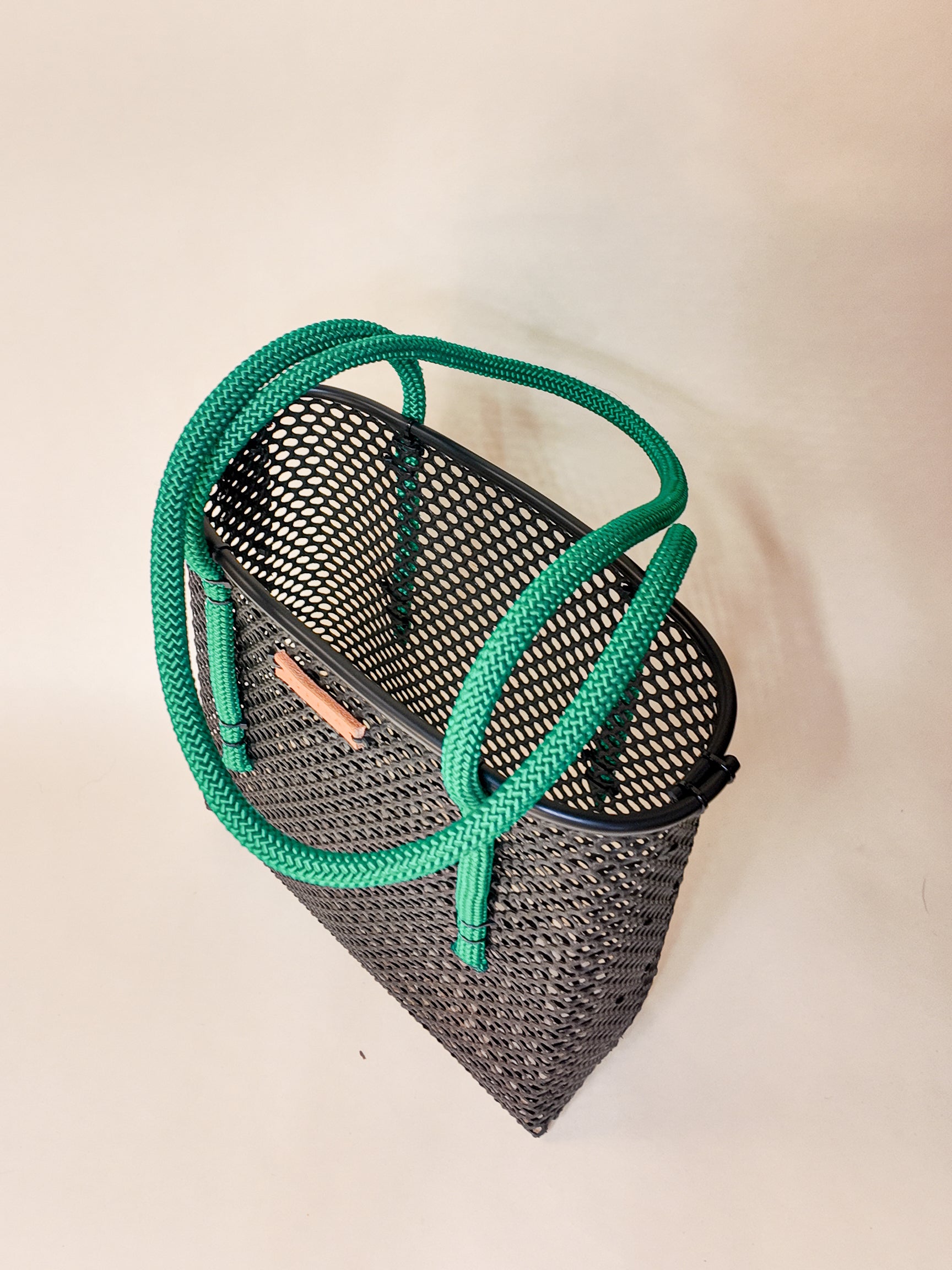 Materials: reclaimed oyster nets, upcycled climbing rope handles, rubber liner and zip ties.
