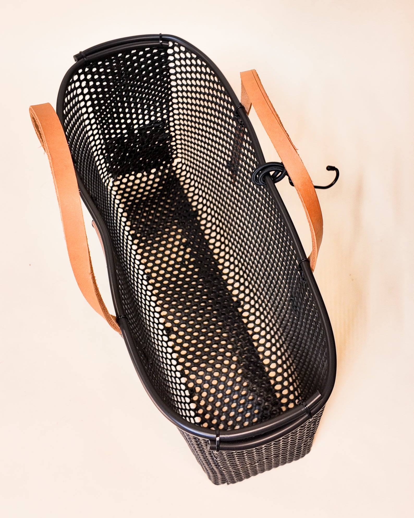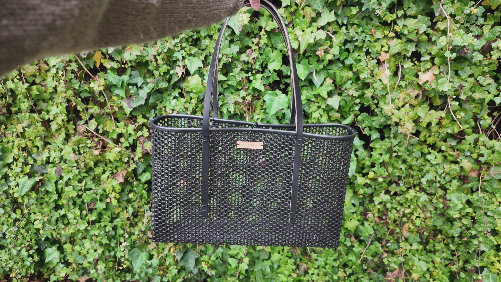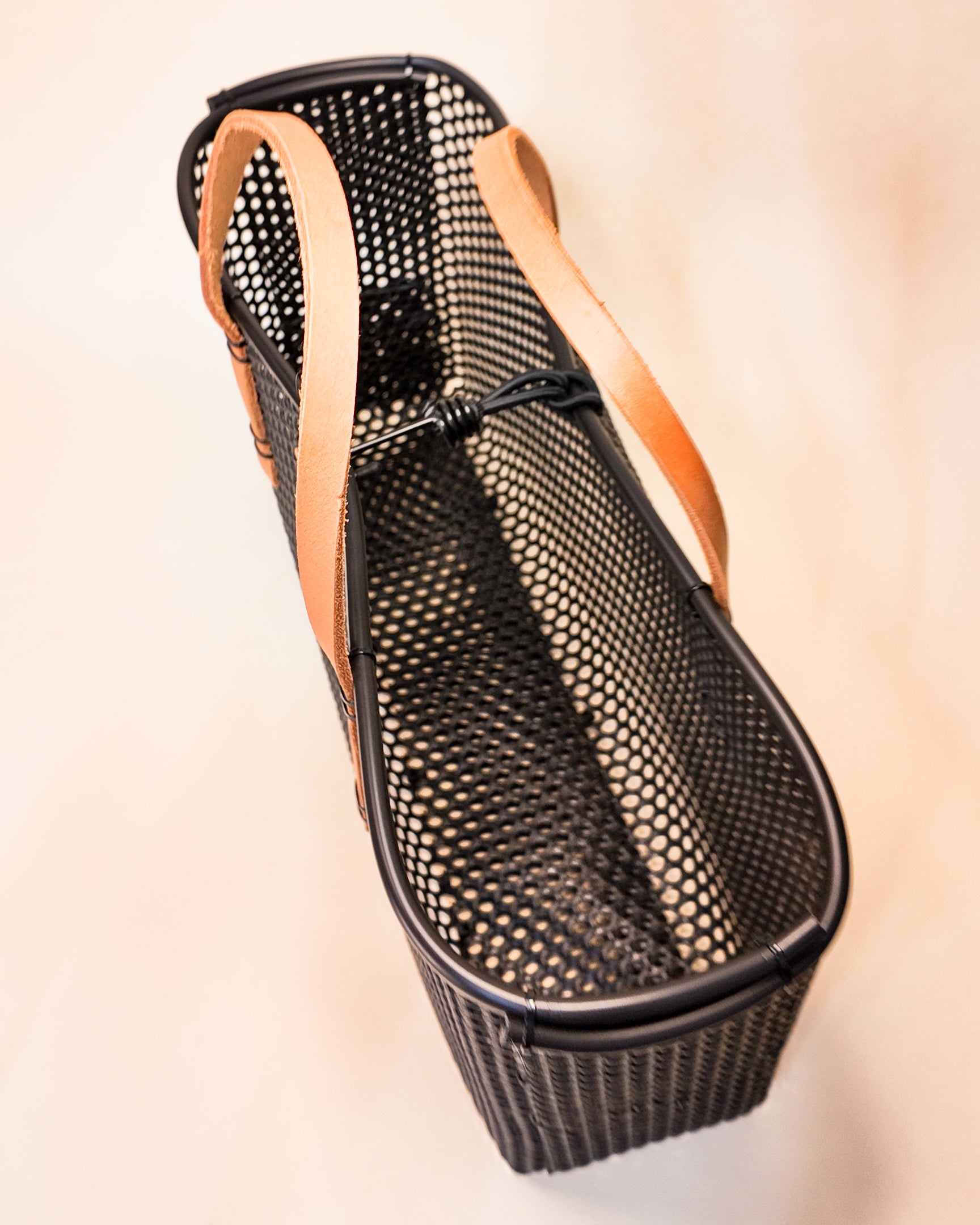 Materials: reclaimed oyster nets, leather handles, rubber liner and zip ties.